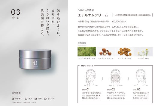 ■Eteramブランドについて「エテルナム」それは、再生医療研究から生まれたスキンケアブランド。LIPセラムとはじめ、医療機関専売のスキンケア、一般消費者向けのスキンケアを展開しています。「エテルナム」はラテン語で「永遠」を意味し、希少価値の高い臍帯由来間葉系幹細胞を独自に培養した上清液で、これまでにない美を届けます。心の奥に宿る「永遠の美」への憧れに、贈るもの。 想いに寄り添い、進み続ける自信をくれるもの。エテルナムはそんなブランドでありたいと考えます。