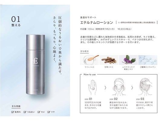 エテルナムシリーズは、そんな中、「どんな肌質でも心地よく使用でき、複合的な肌悩みに全体に働きかける製品があったら。」という想いから開発された商品です。 再生医療研究においても注目を集めるヒト臍帯由来間葉系幹細胞培養上清液を配合したエテルナムスキンケアシリーズは、多種多様な肌悩みに対して複合的にアプローチし、細胞自体を活性化させ正しい働きに導く、サイトカインやエクソソームと呼ばれるペプチドが含まれています。これらは、ケアをすべきポイントに自動的に働きかけてくれる、知るほどその可能性にときめくスキンケアです。悩みが一つではないからこそ感じていただきたい様々な嬉しい変化。是非ご体感いただきたいと思っております。