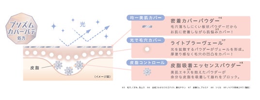 毛穴落ちしにくい板状のパウダーで、肌悩み※3をカバーする『密着カバーパウダー※6』、光を拡散するパウダーがヴェールを形成して毛穴の凹凸を厚塗り感なくカバーする『ライトブラーヴェール※7』、美肌エキス(ノイバラ果実エキス/整肌成分)を抱えたパウダーが余分な皮脂を吸着する『皮脂吸着エッセンスパウダー※8』で、1日中毛穴崩れをブロック。