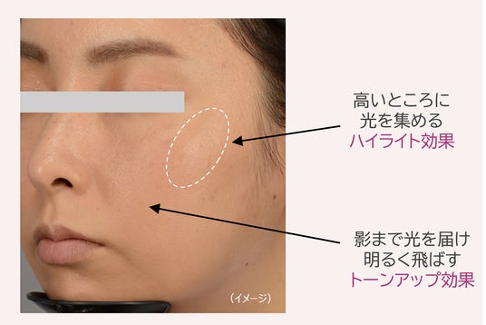 細かな影にまで光を届け、影を飛ばしてふんわり明るくトーンアップ。さらに頬の高いところに光を集めるハイライト効果で、リフトアップしたかのような立体感を演出。毛穴も目立ちにくく、ツヤが引き立つ肌に仕上がります。