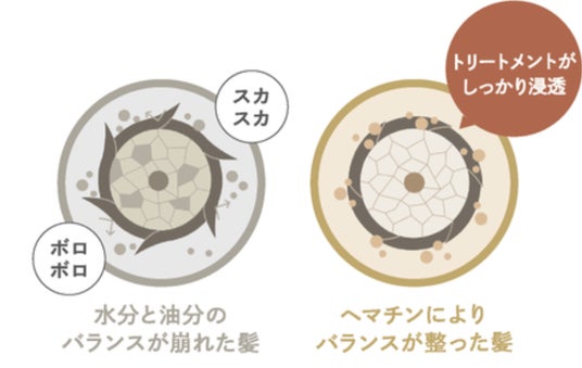 ヘマチン原液とケラチンがダメージにより水分を含みやすくなった髪の水分と油分のバランスを整えます。バランスが整った髪はトリートメントの浸透※力がアップし、髪によく浸透※することで、トリートメントの効果を最大限に引き出すことができます。
