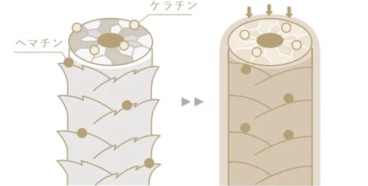 ヘアサロンなど、美容のプロの現場で使われているヘマチンを原液で配合しました。集中補修成分のヘマチン原液と髪の主成分のケラチンが髪内部とキューティクルまで浸透※し、髪の内側と外側をダメージ補修します。補修することで傷んで扱いづらかった髪を、ハリとコシのあるすこやかな“艶髪”へと導きます。