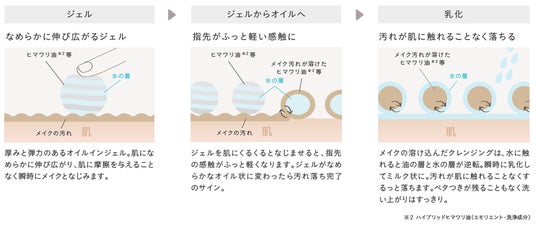厚みと弾力のあるジェルがやさしくメイクや汚れを包み込み、肌への摩擦を軽減。肌になじませるとなめらかなオイルに変化して汚れを浮かせ、さらに水に触れた瞬間にミルク状に変わってすっきりと洗浄。3 段階にすばやくテクスチャーが変化することにより、肌に負担をかけずに汚れを落とします。