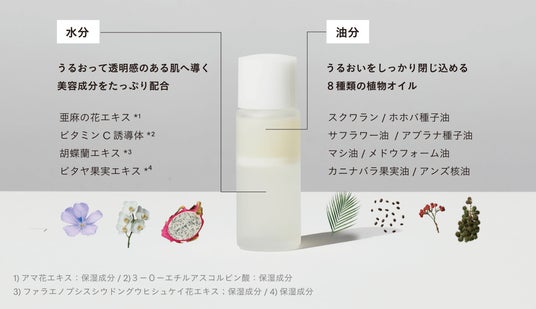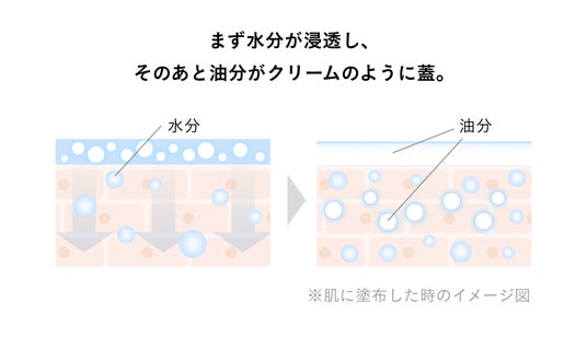 秘密は、天然由来の水分(美容成分)と油分(植物オイル)を黄金比で配合した独自の二層処方。二層を振って混ぜると真っ白な白いオイルが生まれ、肌にのせると水分がみずみずしく広がり浸透*²し、油分がそのうるおいをしっかりと閉じ込めます。
