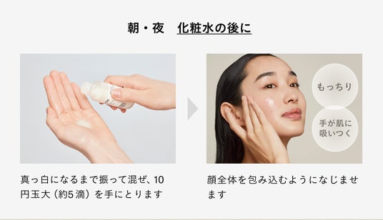 使い方も簡単で、白いオイルを軽く振り真っ白に変わったら、5滴ほど(10円玉大)を手に取ります。顔全体を包み込むようになじませると、手に吸い付くようなもっちり肌を実感いただけます。
