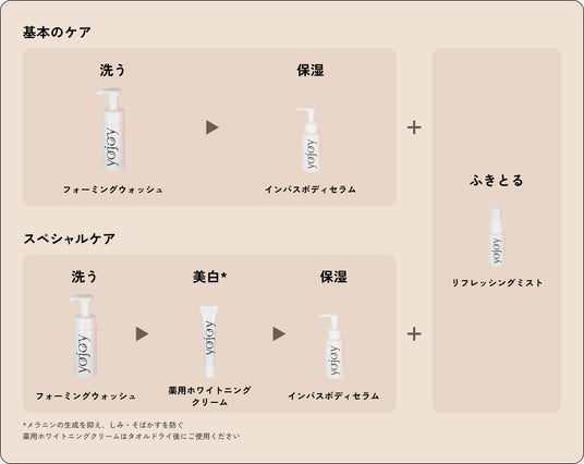 今回発売する[薬用ホワイトニングクリーム]は、既に発売している「YOJOY」のボディケアアイテムとのライン使いがおすすめです。