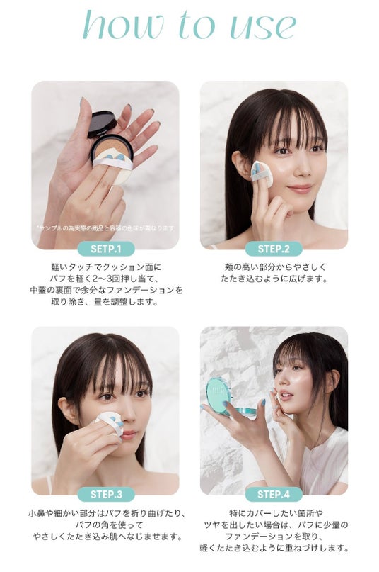毎日使える軽い使用感のクッションファンデは、毎日自分の顔で試しながら何度も何度も試作を繰り返した末にようやくできたもの。