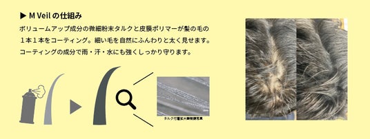 「M Veil -Natural Black-」(Lv4相当)は黒色に着色した微細粉末タルクと皮膜ポリマーを噴霧することにより、髪の毛1本1本を太く見せ、白髪をカバーすることができる。