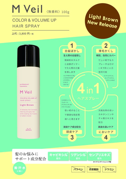 白髪や薄毛などの頭皮と髪の毛のお悩みを2秒で解決しながら、頭皮ケアとにおいケアもできるヘアスプレー『M Veil』から新色・ライトブラウンが発売!