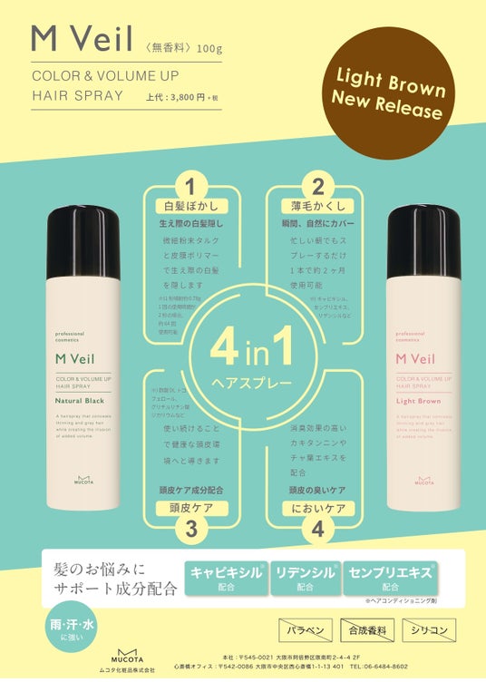 サロン専売品の美容商品・スキンケア商品の製造・販売を行う、ムコタ化粧品株式会社(本社:大阪府大阪市阿倍野区阪南町2-4-4 ライフ昭和町ビル2階、代表取締役:市川 直樹)は、2024年5月22日(水)に発売をした頭皮や髪のお悩み解決に特化したヘアスプレー「M Veil -Natural Black-」の追加色として、2024年9月24日(火)より、『M Veil -Light Brown-』を全国取扱代理店、美容室にて販売を開始いたします。