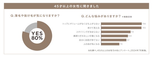 また、「トップにボリュームがなく立ち上がらない」「老けて見える」などが悩みのトップに上がり、そのことから「自分に自信が持てない」「人の目が気になる」という回答も目立ちました。