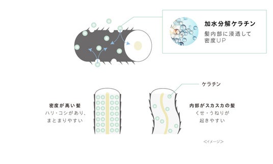 髪の主成分「ケラチン」の分子を小さくして浸透性を高めた「加水分解ケラチン」を配合。
