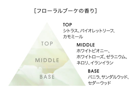 しっとりと柔らかい花びらが繊細なレースのように重なり合うホワイトピオニーに、気高く優美な ホワイトローズ。純白の花々が咲きこぼれる庭園へ誘うオードパルファム。ピュアなムードを醸し出す、みずみずしく透明感のあるフローラルノートが広がります。