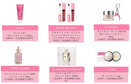 (アヴェダ 、エスティ ローダー 、クリニーク、ジョー マローン ロンドン、ラ・メール、ボビイ ブラウン)にてキャンペーン支援製品の販売を開始します。収益の一部は、米国乳がん研究基金(BCRF)やJBCRG (Japan Breast Cancer Research Group) 等を通して医療研究に役立てられます。