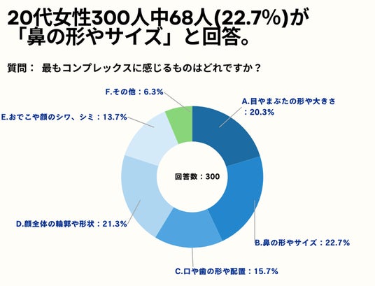 「最もコンプレックスに感じるものはどれですか?」というアンケートで最も多かった回答は「B.鼻の形やサイズ」で全体の22.7%となりました。次いで多かったのが「D.顔全体の輪郭や形状」(21.3%)、「A.目やまぶたの形や大きさ」20.3%というという結果になりました。