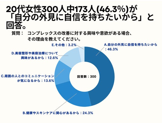 また、「コンプレックスの改善に対する興味や意欲がある場合、その理由を教えてください。」というアンケートで最も多かった回答は「A.自分の外見に自信を持ちたいから」で全体の46.3%となり、次いで「B.健康やスキンケアに関心があるから」が20.8%という結果になりました。