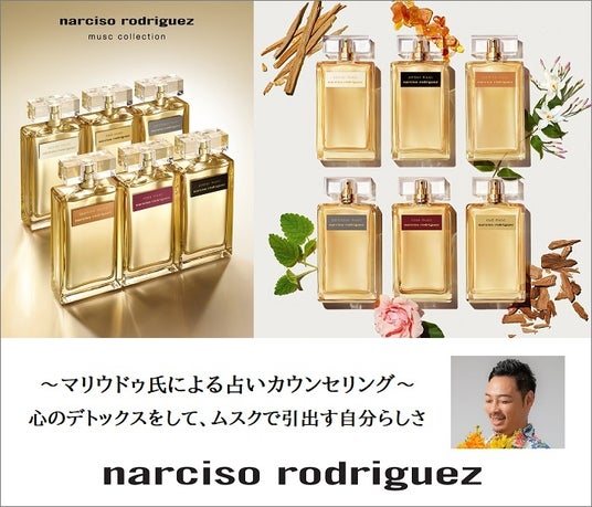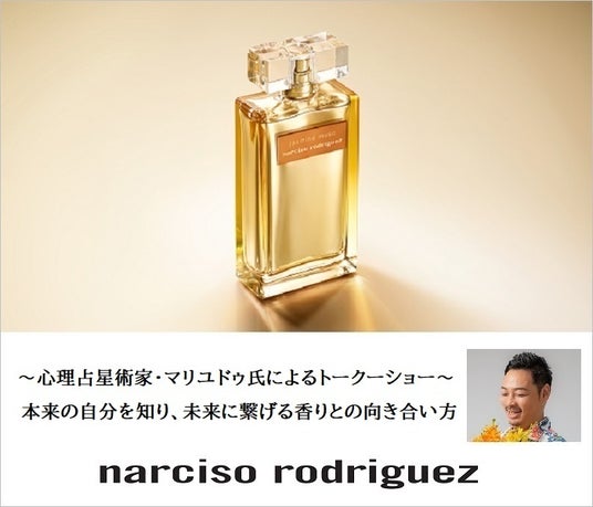 今年のテーマ「その香りは、私自身のようだった。」にちなみ、本館6階 催物場 コンテンツブースでは、上級メンタル心理カウンセラー、マインドフルネススペシャリスト、アロマテラピー検定1級取得の心理占星術家・マリユドゥ/真龍人氏をお迎えし、「自分自身の解放」をテーマに、占星術で本来の自分を知り、未来に繋げるための占いや香りとの向き合い方をご紹介いたします。また、ブランドブースでも、占星術とタロットを使って、なりたいあなたのイメージを演出する香りのご提案など、あなたの持つ輝きを引き立てるカウンセリングで、<ナルシソ ロドリゲス>ムスクコレクションからおすすめの香りをセレクトさせていただきます。