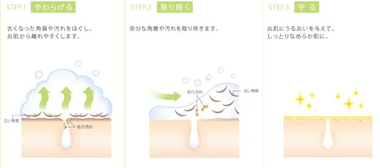 オリーブスキンスイッチ処方は3種のオリーブ由来成分※1で、乾燥でごわつきがちな肌に【やわらげる・取り除く・守る】の3ステップでアプローチします。うるおいは残しながら古くなった角層をやわらげ、不要な汚れや余分な皮脂を取り除くことで、しっとりなめらか素肌に整えます。