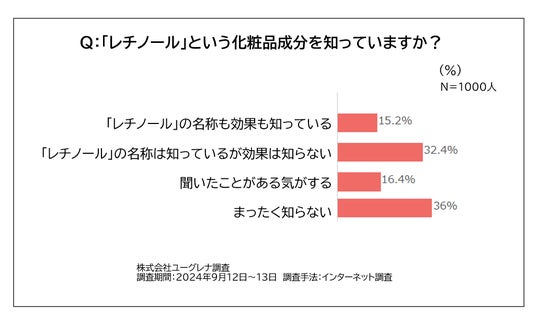 株式会社ユーグレナ(本社:東京都港区、代表取締役社長:出雲充)が全国の20代から70代の女性1000人に行ったインターネット調査によると、レチノールについて「まったく知らない」という人は36.0%と4割を切っており、6割以上の人がその名称は耳にしたことがあるようです。しかし、効果についても正しく認知している人はわずか15.2%にとどまります。