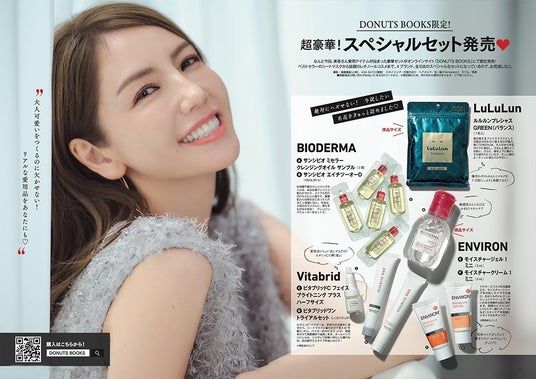 今回は美香さんが実際に愛用しているスキンケアを付録にしたスペシャルセット版も数量限定発売されます。「ルルルン」や「ビオデルマ」など人気スキンケアブランドの現品サイズのアイテムも入った豪華な内容になっています。オンラインサイト「DONUTS BOOKS」のみでご購入いただけますのでお見逃しなく!