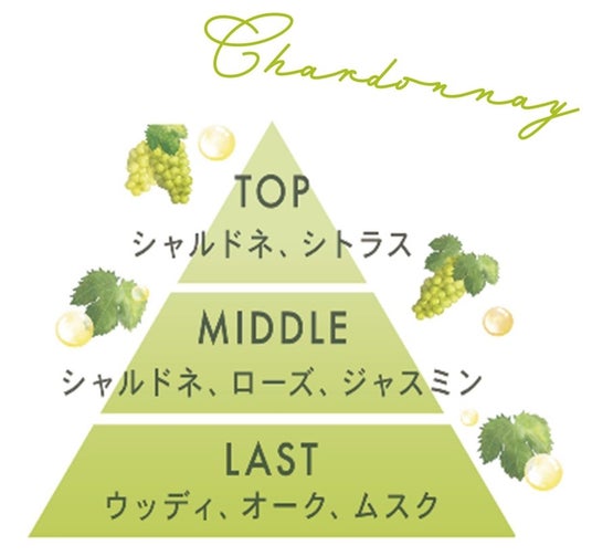 シャルドネと泡(シャボン)の芳醇な香りはじけるシャンパンの泡のように香り立つシャルドネと、ワイン樽のような奥深いウッディが調和した芳醇な香りです。各ノートの繊細かつ豊かで複雑な香りは、使用する人の個性やムードに深みを加え、洗練された印象を与えます。