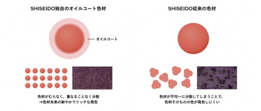 SHISEIDO独自開発のオイルコート色材を採用しました。オイルコートによって色材が分散しやすくなるので、色材本来の色がきれいに発色します。また、汗や水に強く、仕上がりが長持ちします。
