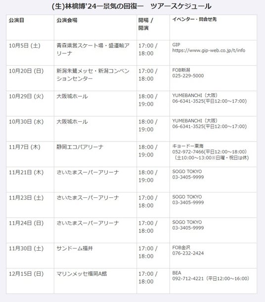 2018年の「(生)林檎博’18-不惑の余裕-」以来となる、6年ぶりのアリーナライブツアーです。その名も「(生)林檎博’24-景気の回復-」。10月5日の青森県営スケート場・盛運輸アリーナを皮切りに、全国7会場10公演。さいたま、大阪、福岡のほか、青森・新潟・静岡・福井で開催します。数年に一度の”Ringo Expo”だからこその、特別なステージを、どうぞご期待ください。
