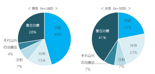 – 治療方法は、男性は「内服」が最多の46%。女性は「複合治療※」が最多の41%