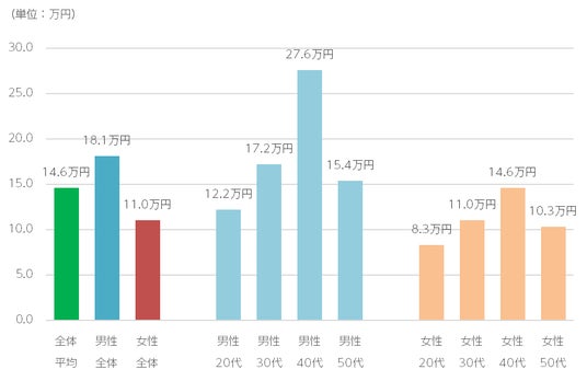 – 男女ともに、40代が最も高額(男性27.6万円、女性14.6万円)