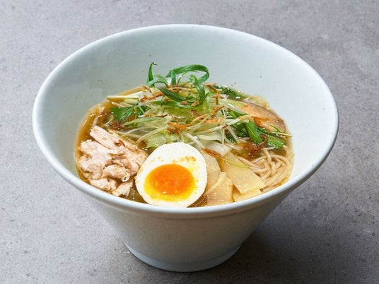 野菜鶏こうじ麺 鶏ガラと魚介の合わせスープで仕上げたやさしい味わいの醤油ラーメンに、塩こうじとしいたけの旨味でマリネしたチンゲン菜やこだわりのぬか床に漬けた卵、蒸し鶏などを加えました。