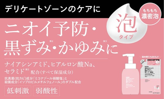 ポンプにはワンプッシュでクリーミーな泡が出るリッチフォーマーを採用し、デリケートゾーンをきめ細かな濃密もちもち泡で優しく簡単にケアできます。