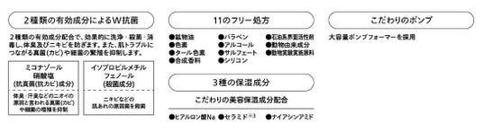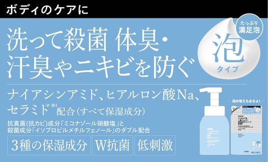 2種類の有効成分配合で、効果的に洗浄・殺菌・消毒し、体臭及びニキビを防ぎます。また、肌トラブルにつながる真菌(カビ)や細菌の繁殖を抑制します。11のフリー処方※2に加え、ヒアルロン酸Na、セラミド※3、ナイアシンアミド、こだわりの美容保湿成分も配合しました。