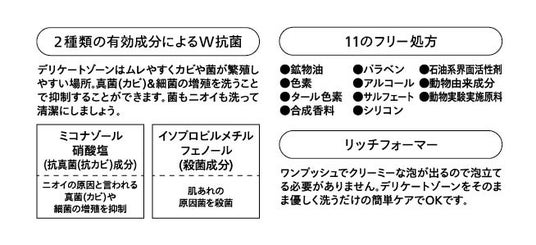 2種類の有効成分によるW抗菌で、真菌(カビ)&細菌の繁殖を洗うことで抑制することができます。ニオイ予防、黒ずみ※4、かゆみ※5にお悩みの方にもおすすめです。11のフリー処方※2、ナイアシンアミド、ヒアルロン酸Na、セラミド※3など、こだわりの美容保湿成分も配合しました。