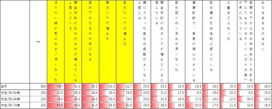 ■45歳以上の女性が自覚する「見た目の変化」で、たるみやシワなどの「顔」の見た目に変化を感じている人が多い。
