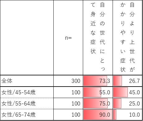 骨粗しょう症に対するイメージを聞いてみたところ、年代が低い方が「自分より上の世代がかかりやすい症状」と考えていることが分かりました。
