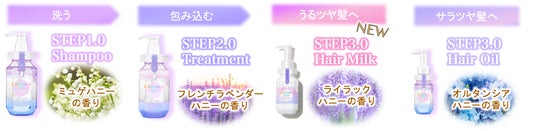 シャンプーはフランス産スズラン*9を使用したミュゲハニー、ヘアトリートメントはフランス産ラベンダー*10を使用したフレンチラベンダーハニーの香り、ヘアミルクはヨーロッパ産ライラック*11を使用したライラックハニーの香り、ヘアオイルは国内産アジサイ*12を使用したオルタンシアハニーの香りを採用。上品で華やかなフローラルが重なる香りをアイテムごとにお楽しみいただけます。