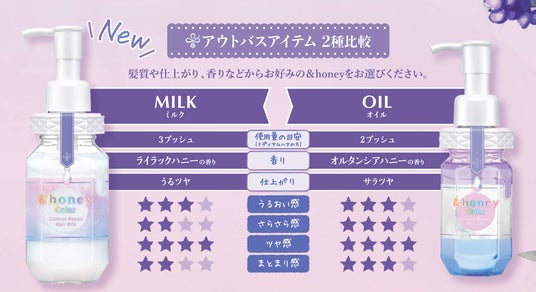 カラーケアに特化したシリーズ『&honey Color(アンドハニー カラー) 』に潤い感をプラスした新たなアウトバスアイテムが仲間入り。新アイテムのヘアミルクで、うるおいとツヤが溢れる仕上がりもお選びいただけるようになりました。