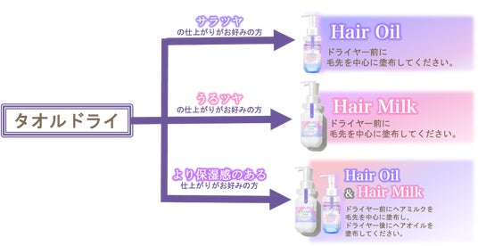 タオルドライ後の髪にヘアミルクをご使用いただくことでその後使用するヘアオイルの効果をより実感いただけます。