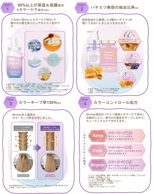 2024年4月に登場した『&honey Color』はハチミツ*1とカラーケア成分*2の力で、染めたての髪色キープを目指したシリーズ。カラーによる褪色や、髪のパサつきなどのお悩みを独自のカラーコントロール処方で解決してきました。上品で華やかなフローラルの香りも、アイテムごとにお楽しみいただけます。