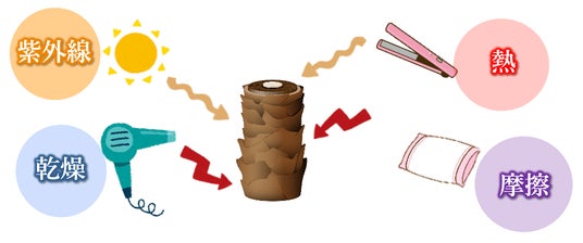ヘアカラーが褪色する主な原因としてヘアカラー後の「紫外線」「熱」「乾燥」「摩擦」などの外的要因が挙げられます。いずれも髪の毛の水分量やキューティクルが健康な状態に保たれていないことで、毛髪内部に色素が留まることができず流れ出して色抜けしてしまいます。