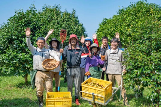 五島の椿は自社農園を保有しており、農園管理人たちが日々愛情を持って管理を行っています。五島列島の南部、福江島にある農園は、2001年から先代が植栽をしはじめ、今では約40,000平方メートル の敷地に約1万本ものヤブツバキが育っています。椿油を搾った後の搾り粕や、剪定した枝を肥料にして畑に戻すといった循環型農園で、「自然由来のもの意外を持ち込まないこと」「収穫した分は肥料を追加すること」「畑から出た廃棄物は畑から持ち出さないこと」といった約束事を作り、循環のサイクルを作りながら管理を行っています。