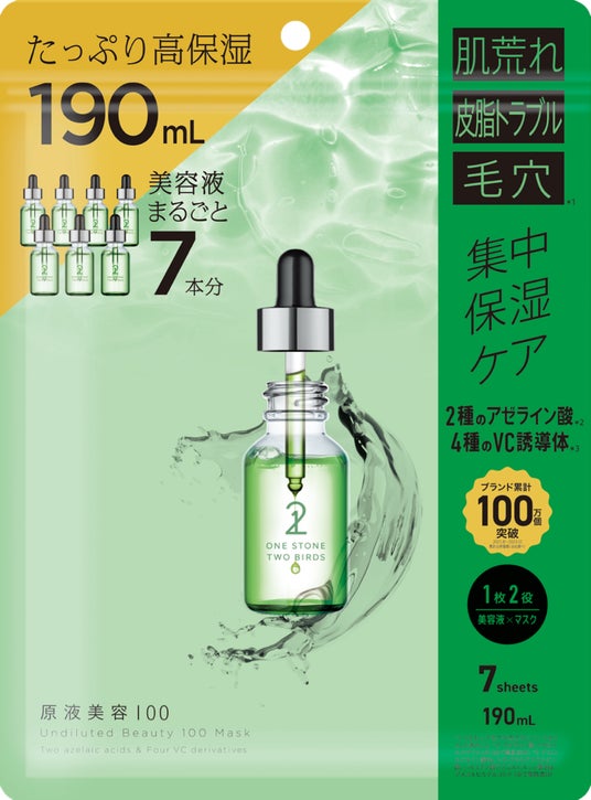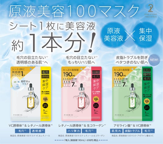 美容ブランド「ONE STONE TWO BIRDS」は、シート1枚に美容液1本を丸ごと贅沢に使った“45分乾かない*1”高保湿シートマスク『原液美容100マスク』を販売中です。この度、店舗限定で発売していた『ホワイトVC&アゼライン酸』をリニューアルし、定番化することを決定しました。