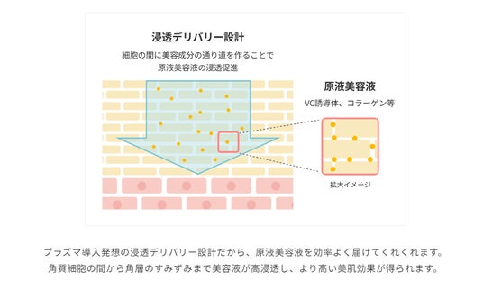 スペシャルケア、プラスケアとして使用されることも多い原液美容液。「原液美容100マスク」は、原液美容液を贅沢に使用した超貯水型の美容マスクで、これ1枚でスペシャルケアが完成します。なめらかな肌触りの超極厚シートが美容液をたっぷり抱え込み、“45分乾かない*1”保湿力を実現。さらに、角質層の隅々まで浸透*9させる“プラズマ導入”発想の浸透デリバリー設計を採用し、美容成分を肌に効率的に届けます。