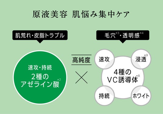 増強された2種のアゼライン酸*2が肌荒れやベタつきを防ぎ、4種のVC誘導体が毛穴の目立たない美肌へ導く1枚。「肌荒れ」「皮脂トラブル」が気になる方へおすすめです。