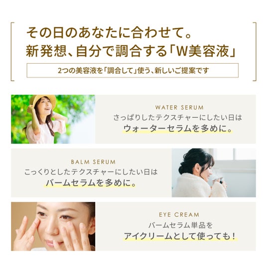 スキンケアを実感できるクレンジングウォーターと、すっと肌になじむふたつの美容液は、その日の肌に合わせて調合できる新感覚の美容法です。