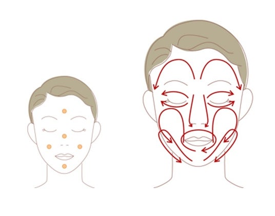 顔の5カ所(両ほお・額・鼻・あご)におき、顔全体になじませます。