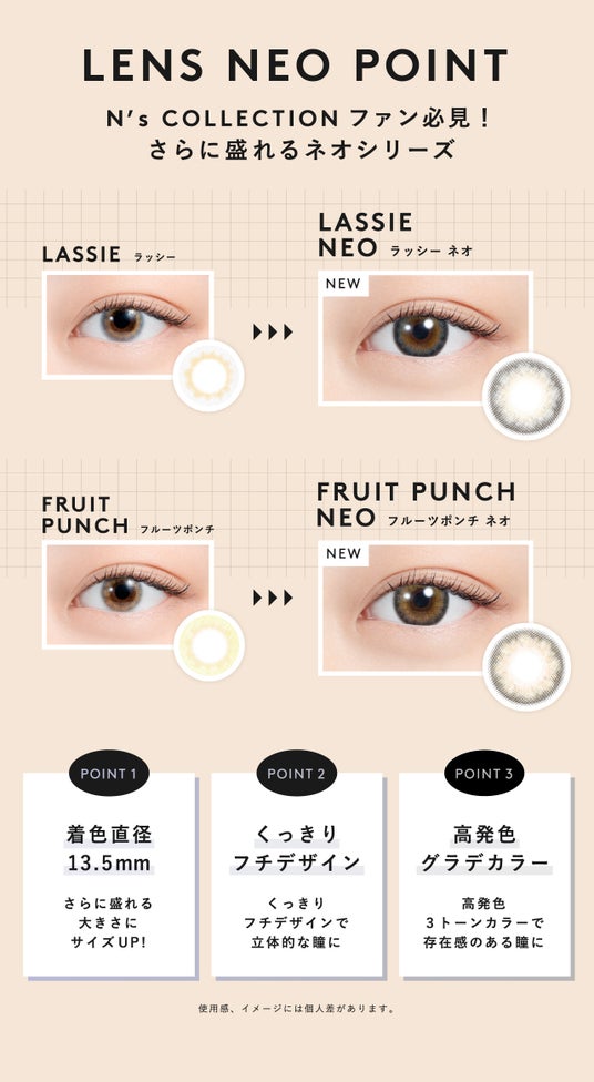 『N’s COLLECTION』待望の新色は、人気カラー「LASSIE(ラッシー)」「FRUIT PUNCH(フルーツポンチ)」が、さらに可愛く“NEO”になって新登場。『N’s COLLECTION』ならではの発色の良さはそのままに、着色直径を大きく、フチデザインを施すことでさらに盛れる仕上がりになっております。「LASSIE NEO(ラッシー ネオ)」「FRUIT PUNCH NEO(フルーツポンチ ネオ)」、どちらも『N’s COLLECTION』ファン必見のカラーラインナップです。