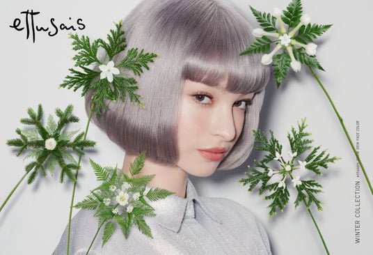 ナチュラルな植物で顔周りを囲うことで、透明感のあるツヤ肌をより引き立たせるビジュアルに。