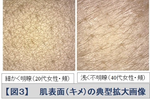 このような仕上がりになる理由のひとつに、この年代でのキメの変化が考えられます。年齢とともに、キメは浅く不明瞭になってきます(図3)が、このことが、ファンデーションの肌への密着性を悪くしています。キメが深くはっきりしていると、化粧下地やファンデーションがキメの凹凸にひっかかり留まりやすいのですが、キメが浅く曖昧な肌は凹凸が少ないため、化粧下地やファンデーションが留まりにくくなります。