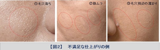 ファンデーションの仕上がりに満足していない30~40代女性の仕上がり状態を観察させていただくと*2、ファンデーションが毛穴に落ちてしまい毛穴がより目立ってしまったり(図21.)、筋ムラができていたり(図22.)、毛穴周辺に溜まっていて(図23.)、求める仕上がりになっていない人が多いことが分かりました。化粧下地やファンデーションが肌に均一に塗られていないため、塗りムラはもちろん、毛穴の中に溜まってしまう仕上がりになっている人もいました。さらに、毛穴やシミ・ソバカスをカバーしようとファンデーションを必要以上に多く塗ってしまう人も。ファンデーションを何度も重ねて塗ってしまうことで、厚塗り感が出たり、一部分に溜まってしまいムラができたりしていました。